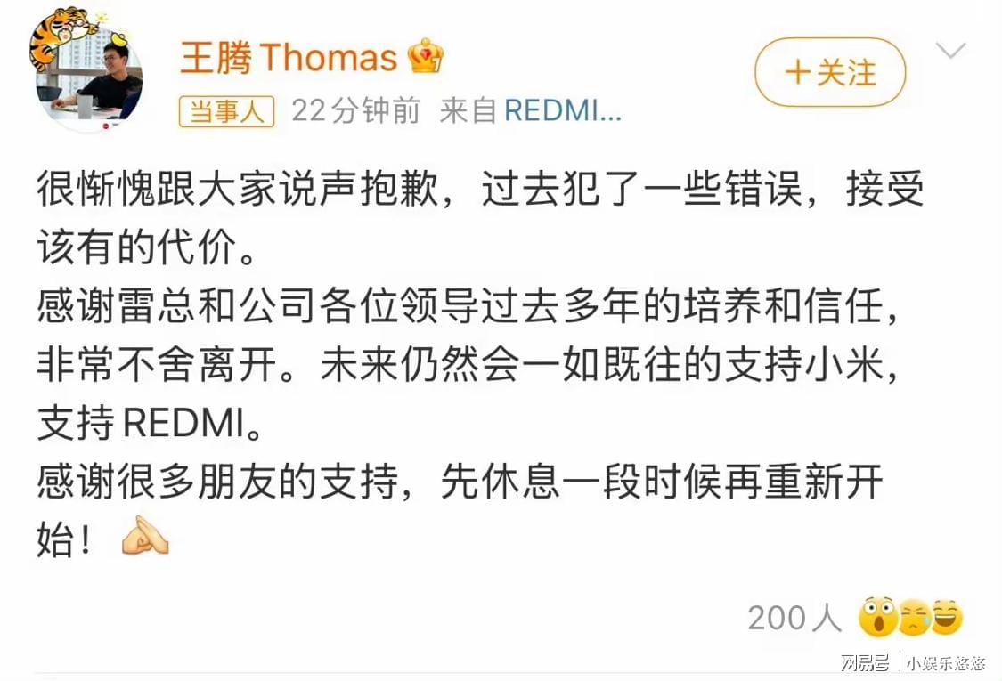 王腾发文回应因泄密被小米辞退"过去犯了一些错误接受该有的代价”感谢雷总和公司的信任和栽培