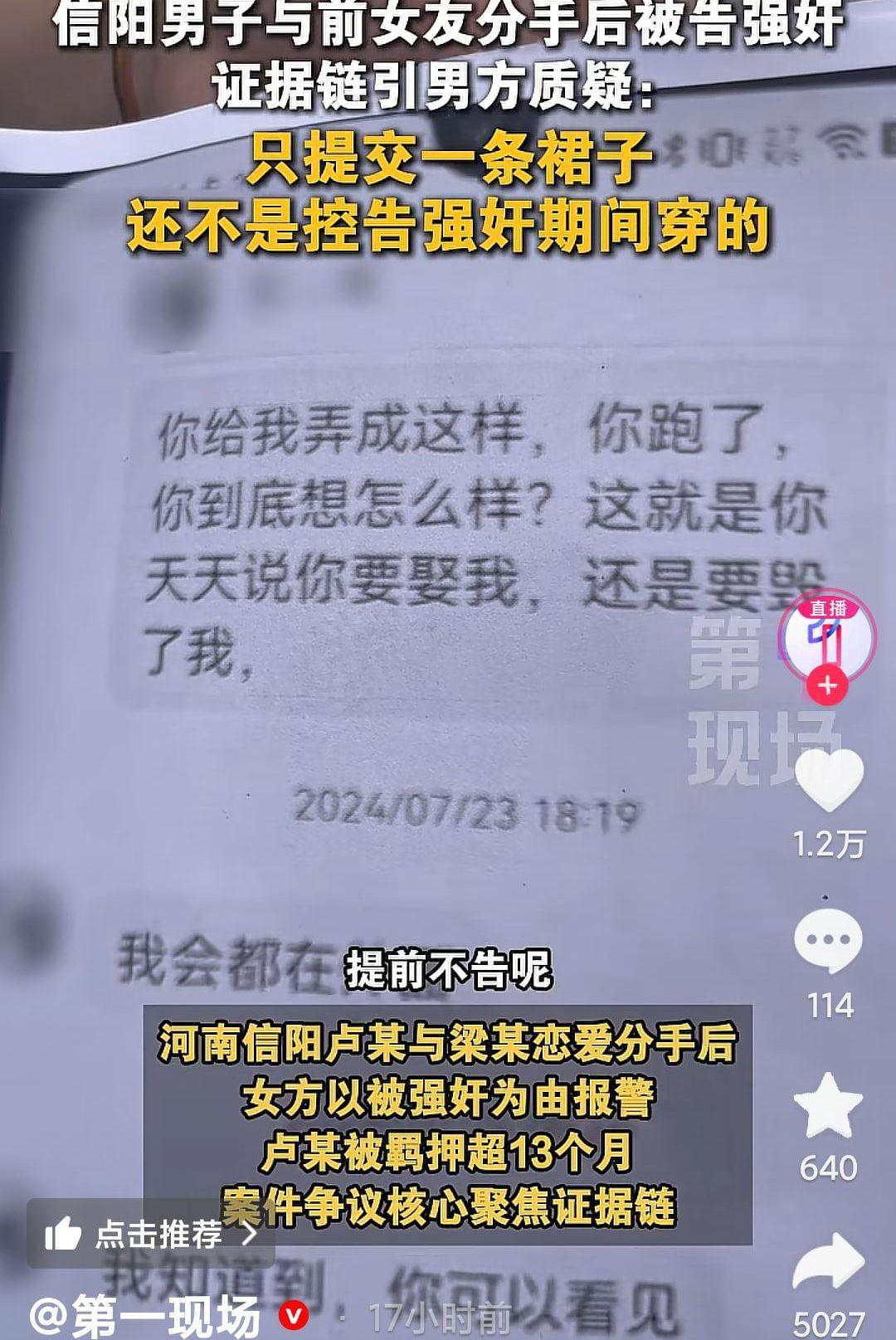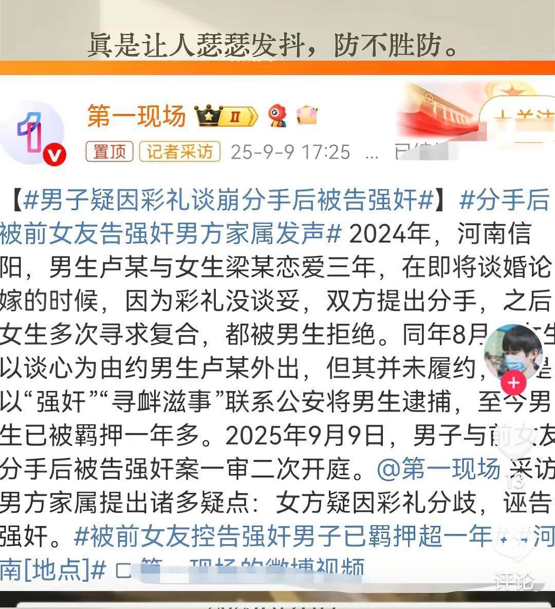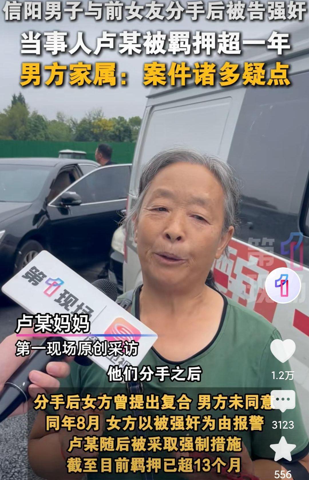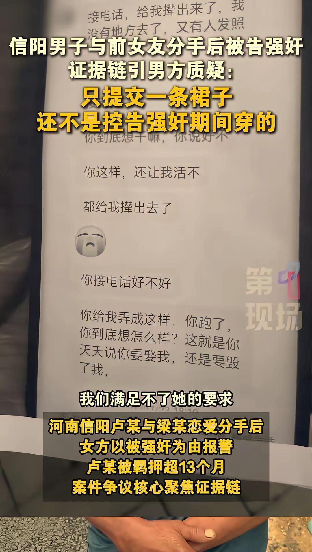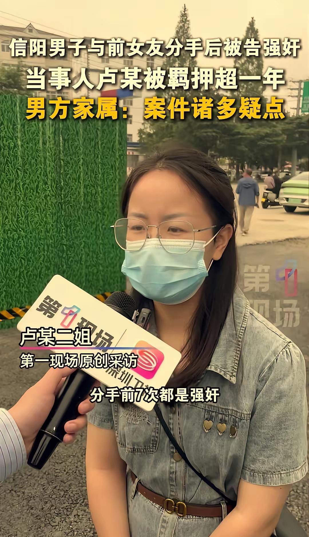 2025年9月9日。河南信阳男子卢某。与前女友分手后被告强奸案一审二次开庭,记者现场采访男方家属,男方家属提出诸多疑点,女方疑因和男方有彩礼分歧,于是告男方强奸。
