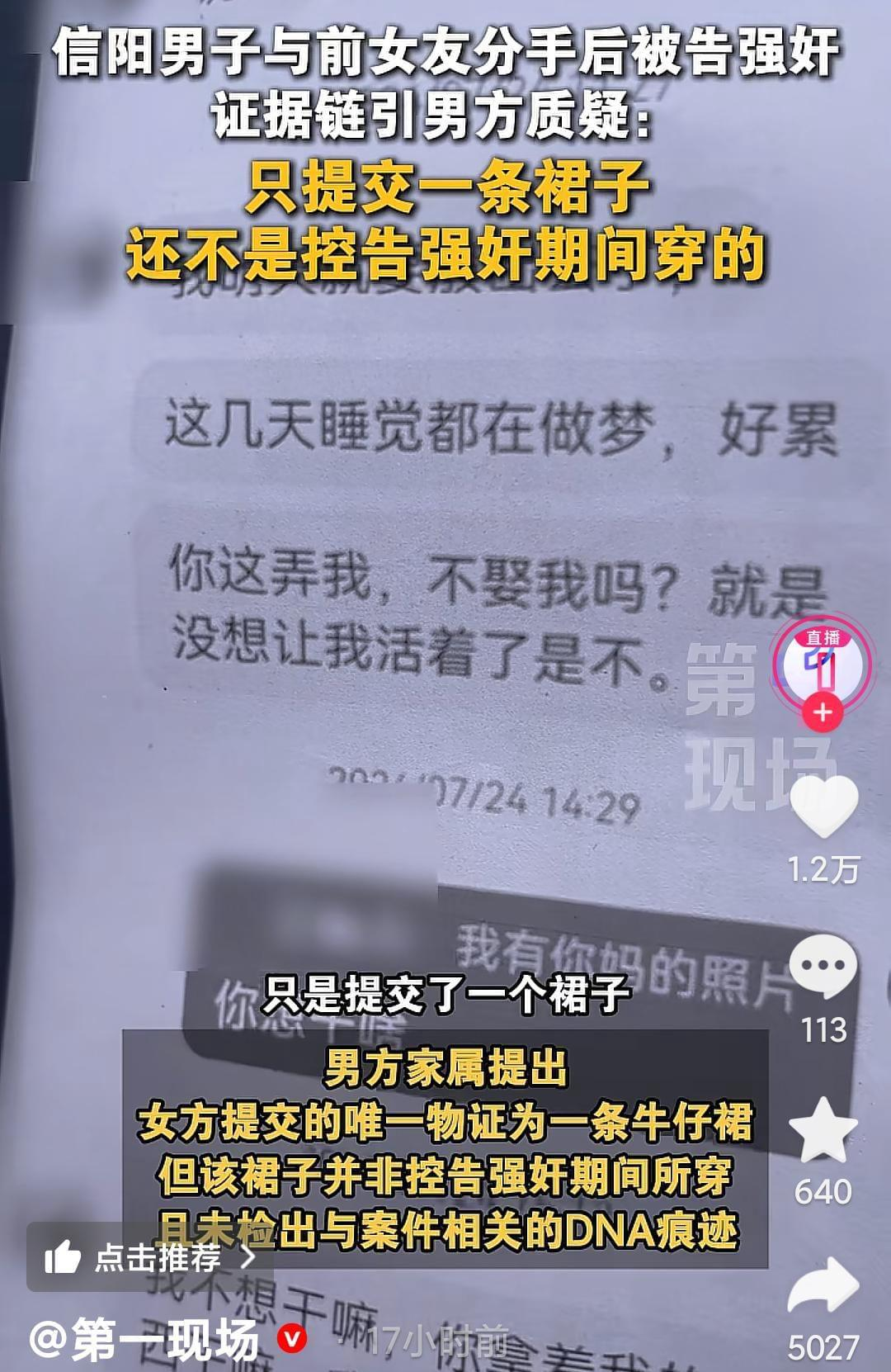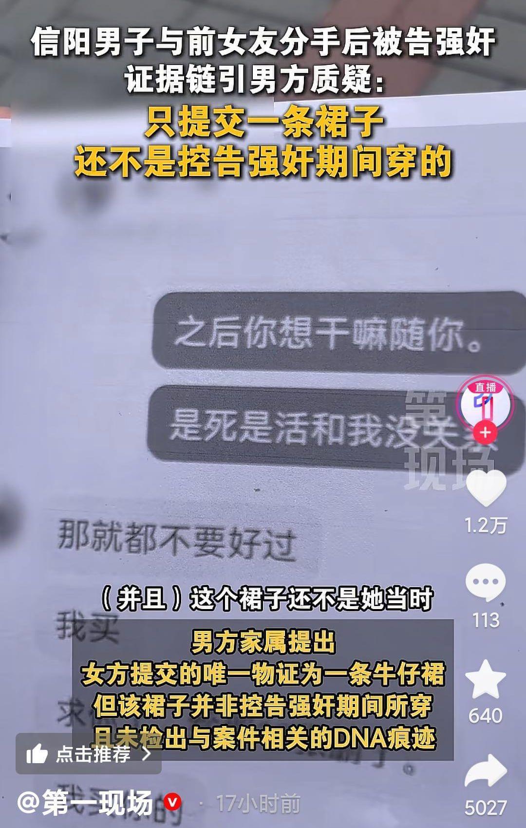 女方称分手后的前7次都是强奸,但提交的证据里面是只有一条裙子,而且这条裙子不是在他们发生关系时间所穿的裙子,裙子上也根本没有检出dna。