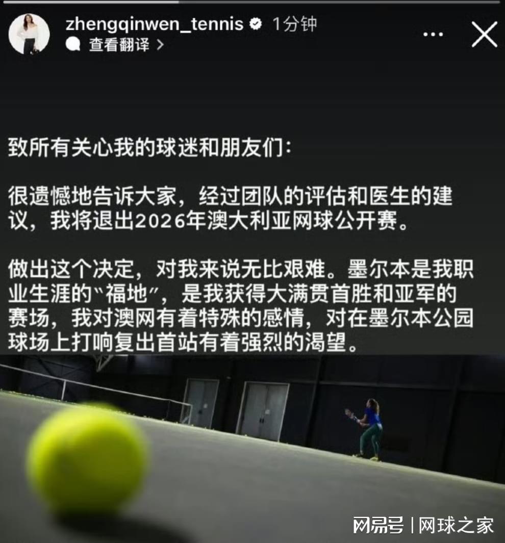 早在中国球员陆续公布2026赛季参赛计划时,唯独没有看到郑钦文公布新赛季参赛计划,很多人就已经猜测,她最终缺席2026澳网的可能性比较大。