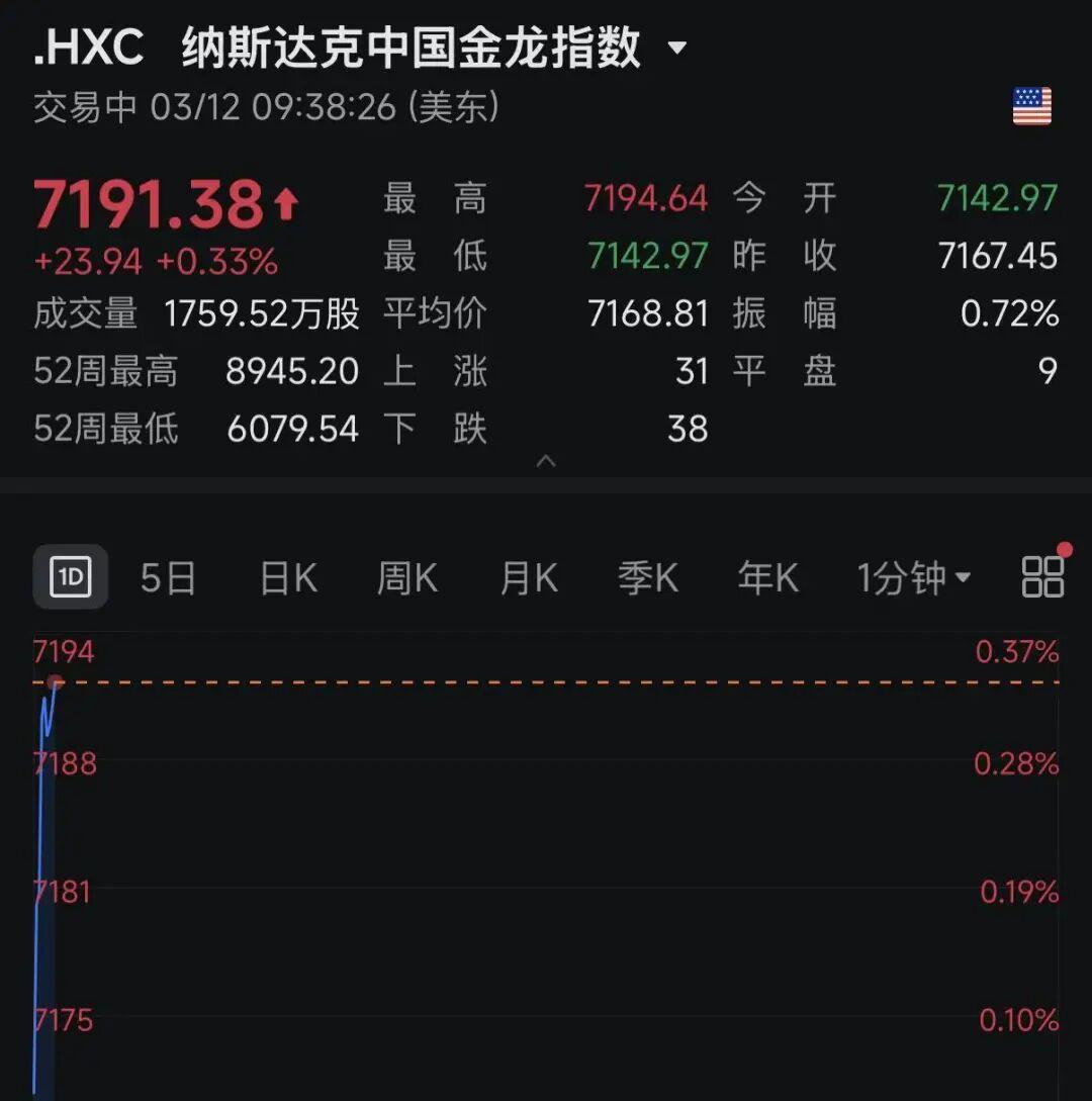 中概股方面,纳斯达克中国金龙指数小幅拉升,截至发稿涨0.3%,个股方面,迅雷涨逾7%,蔚来涨4%,小鹏汽车涨超3%。